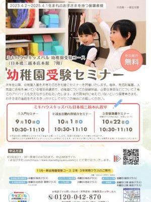 理英会では、9/10(水)、10/1(水)、10/22(水)、三越本店教室にて幼稚園受験セミナーを開催しております。