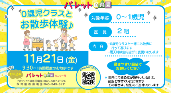 パレット保育園では、10月、11月も園での活動を知っていただける各種イベントを予定しております。